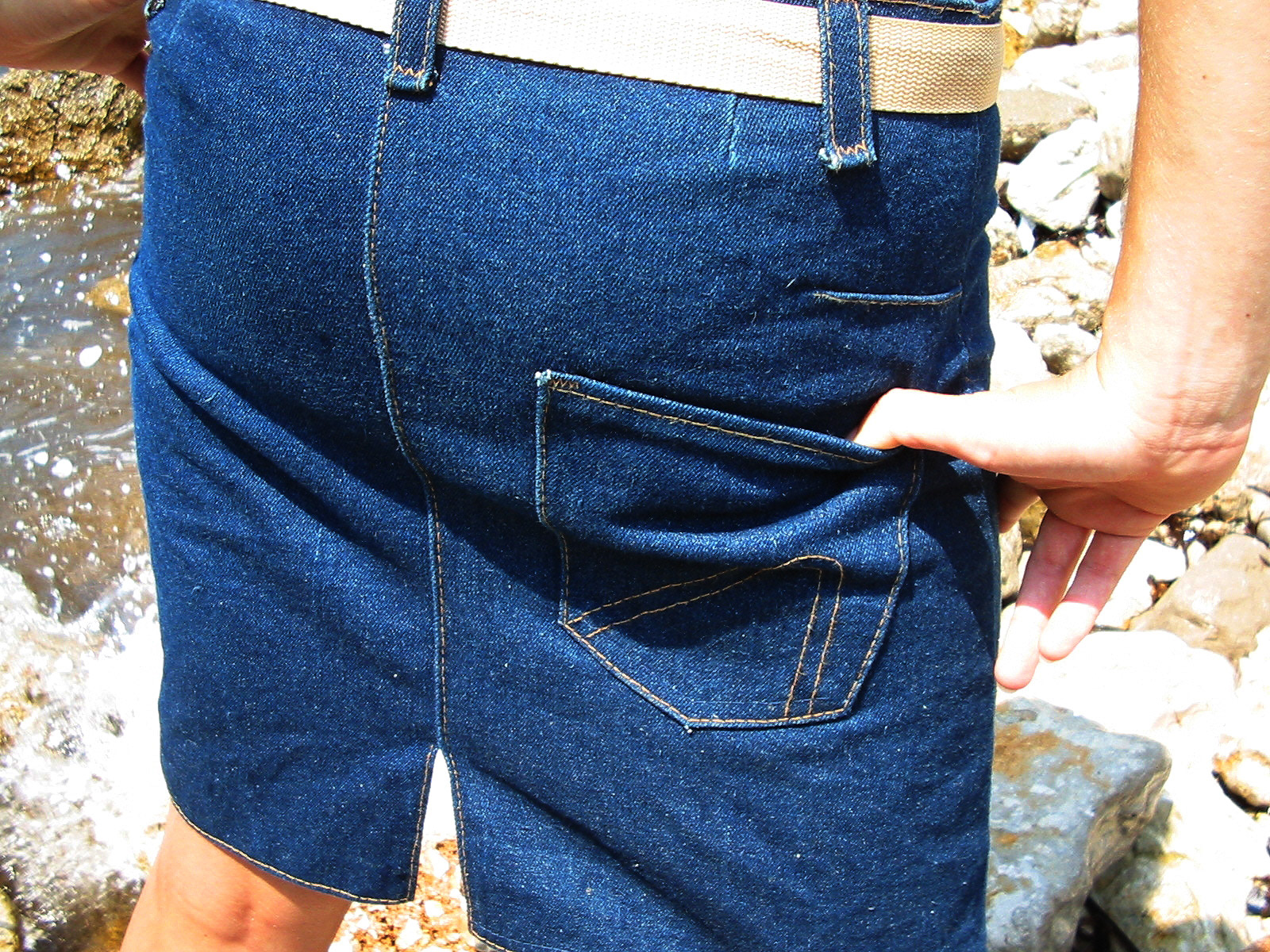 Ručně šitá dámská sukně z tmavě modrého denimu.